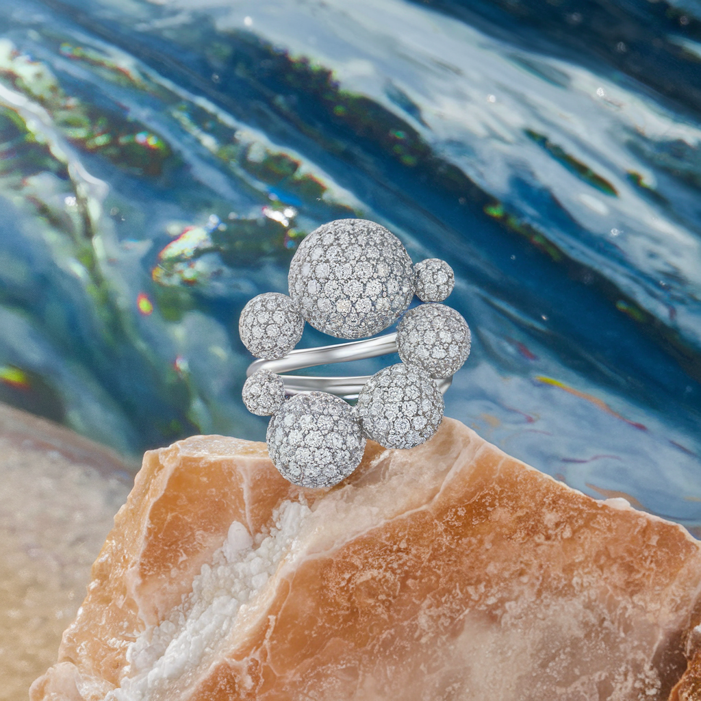 Prompt: "create a white gold and diamond ring that looks like bubbles"