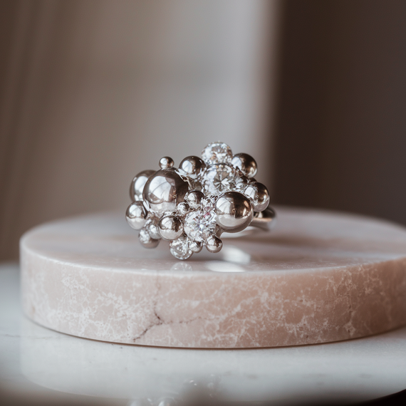 Prompt: "create a white gold and diamond ring that looks like bubbles"