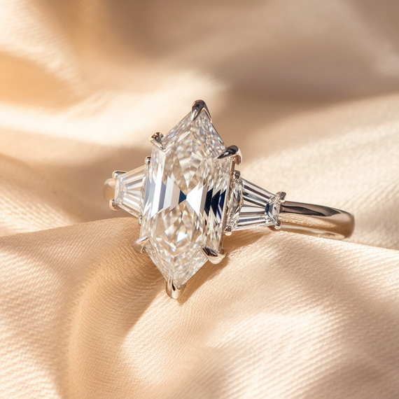 Prompt: "Create a white gold engagement ring with elongated radiant cut diamond with trapezoid diamond side stones"