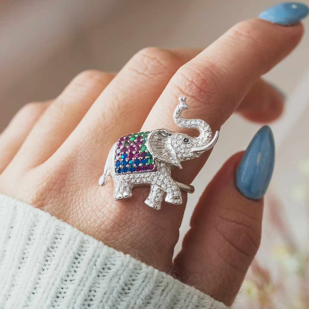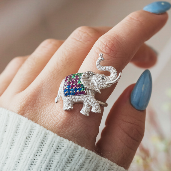 Prompt: "create a white gold elephant ring for a woman's finger accented with colored gemstones"