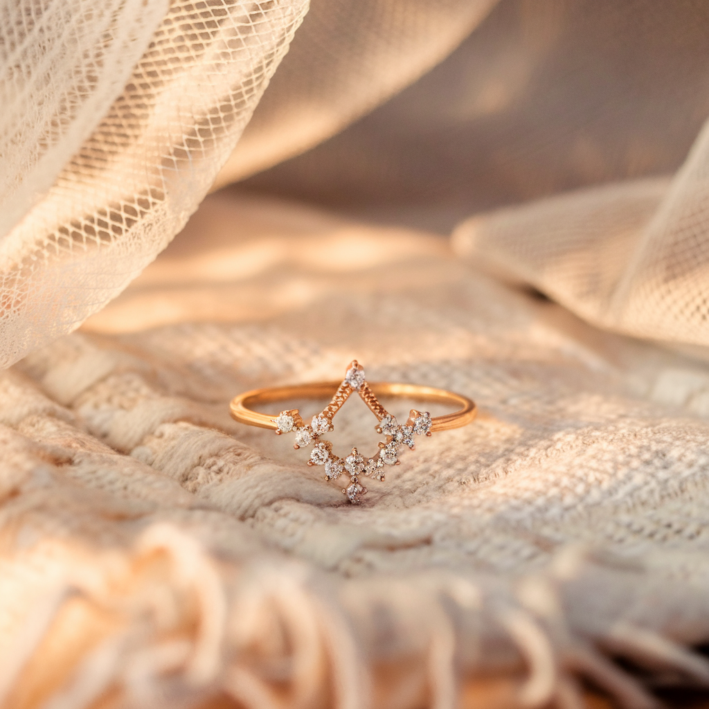 Prompt: "Create a gold ring with diamonds delicate boho inspired fashion ring."