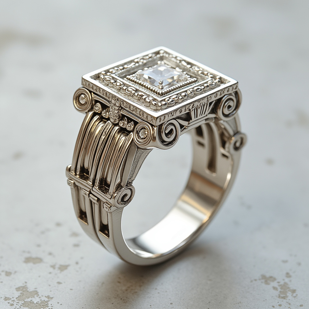 Prompt: "Create White gold ring inspired by a Greek architectural column"