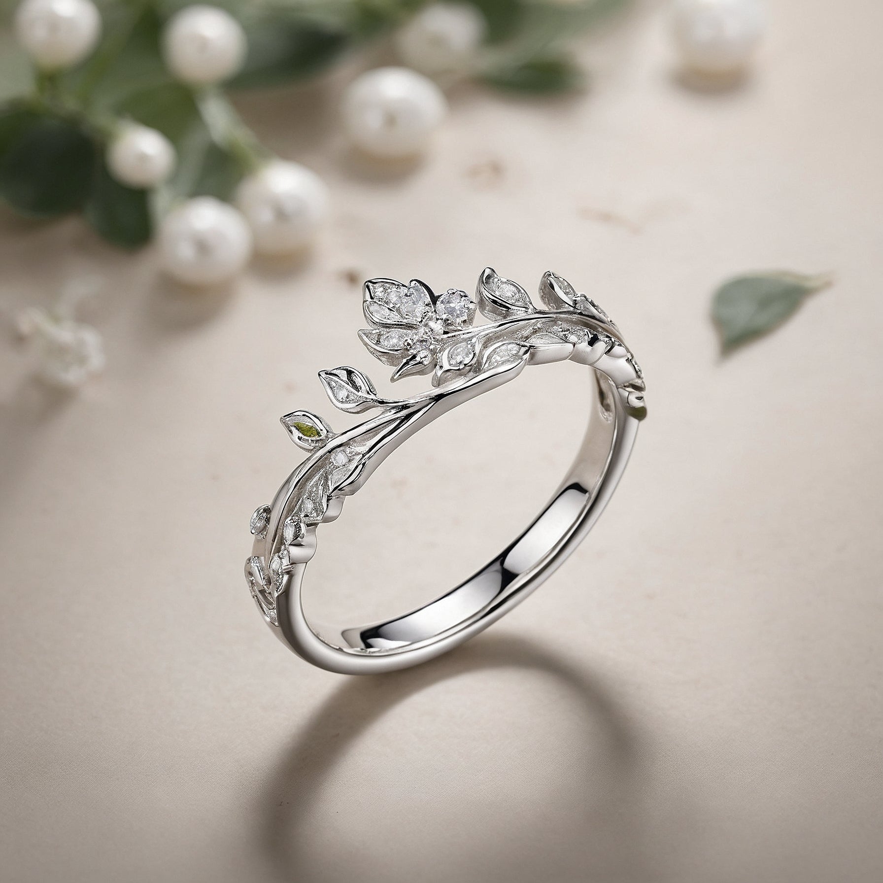 Prompt: "thin stackable diamond band with leaves"