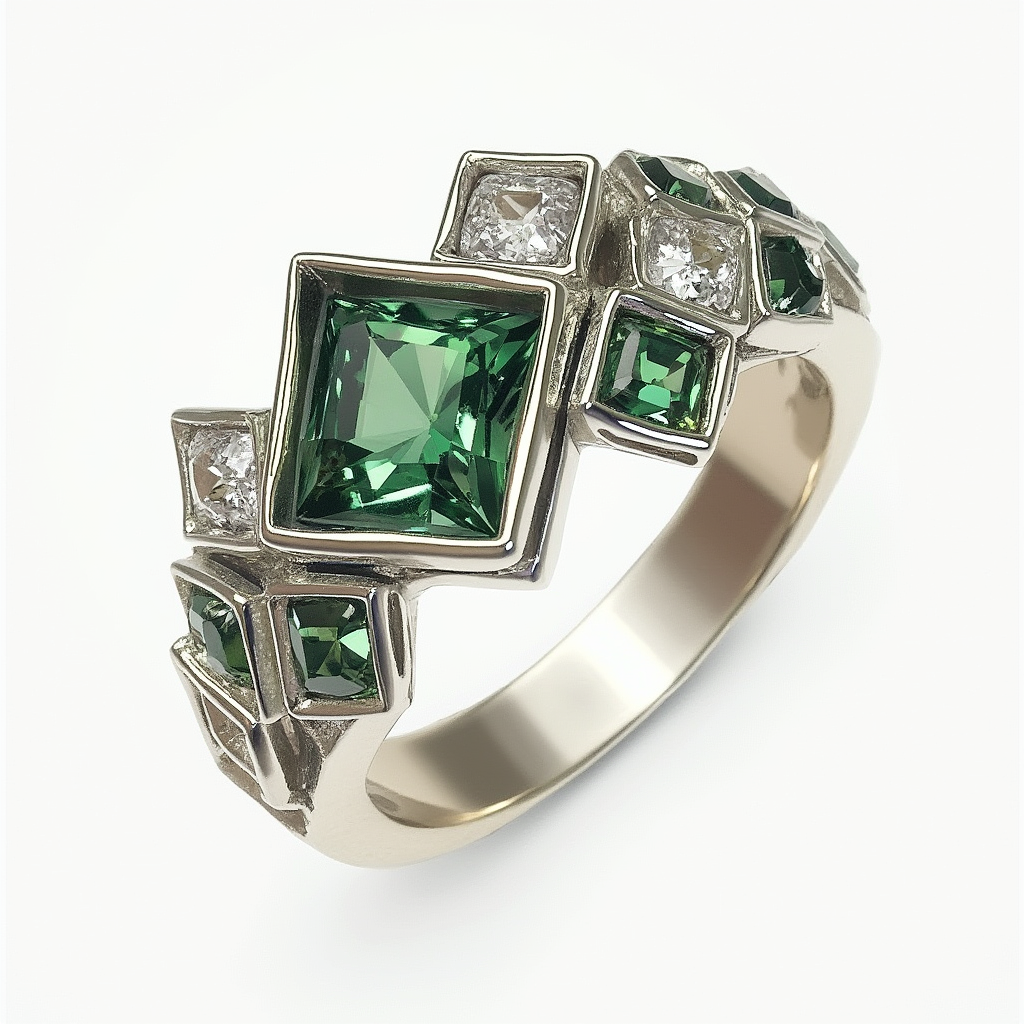 Prompt: "Create a silver ring with triangles holding green stones and diamonds that look like the moon"