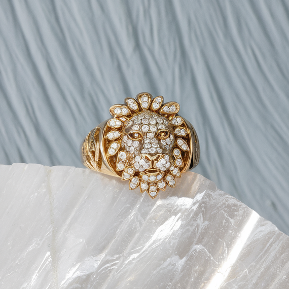 Prompt: "Gold ring lions head with diamonds "
