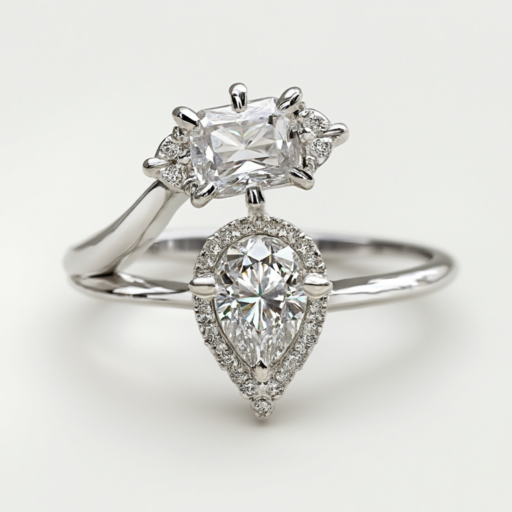 Prompt: "create a white gold ring with one rectangular diamond and one pear shape diamond and plain band"