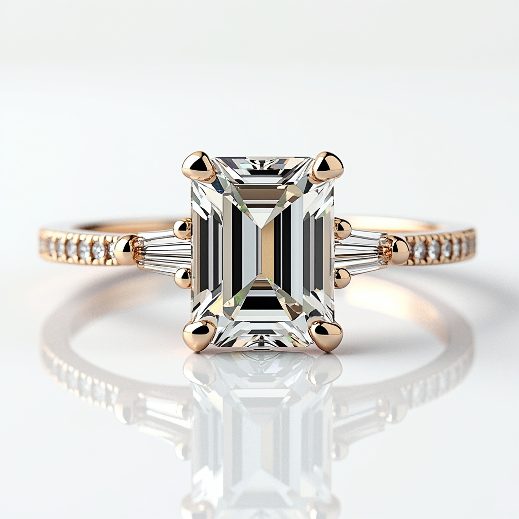 Prompt: "create a very thin elegant engagement ring with simple lines and rectangular radiant cut center diamond"