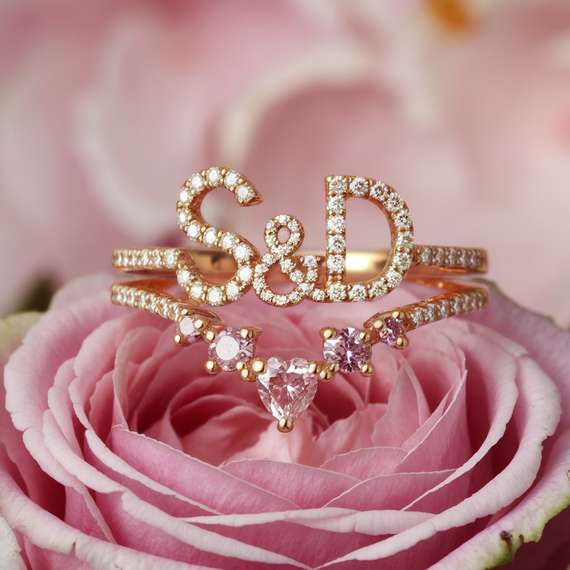 Prompt: "Gold ring with S&D and an heart shape with pink diamonds "