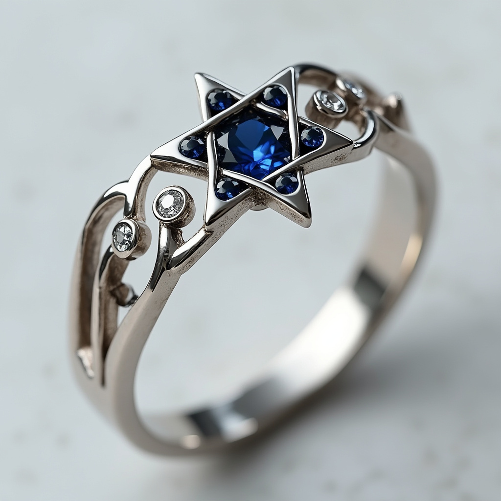 Prompt: "Modern and simple and sleek, women’s silver ring with small Jewish Star and 3 small sapphires and 3 small diamonds"