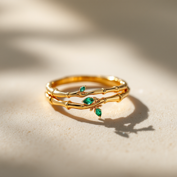 Prompt: "Create a delicate yellow gold bamboo wrap ring accented with emerald leaves."